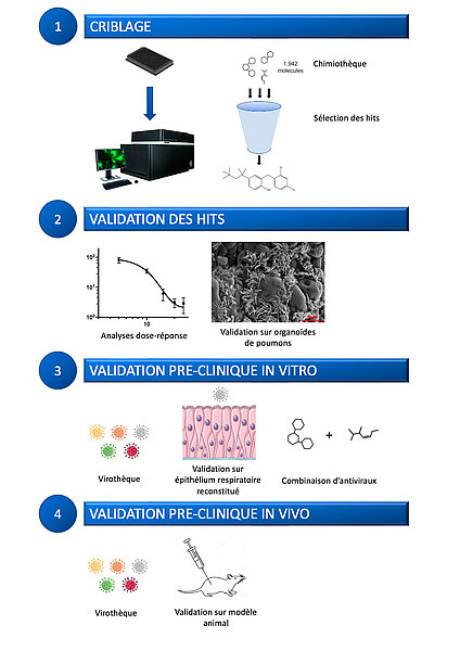 Les hits précédemment identifiés sont ensuite testés in vitro, avec différentes virothèques, sur de l’épithélium respiratoire humain reconstitué. Le cas échéant des combinaisons d’antiviraux peuvent être effectuées grâce à des tests de synergie.